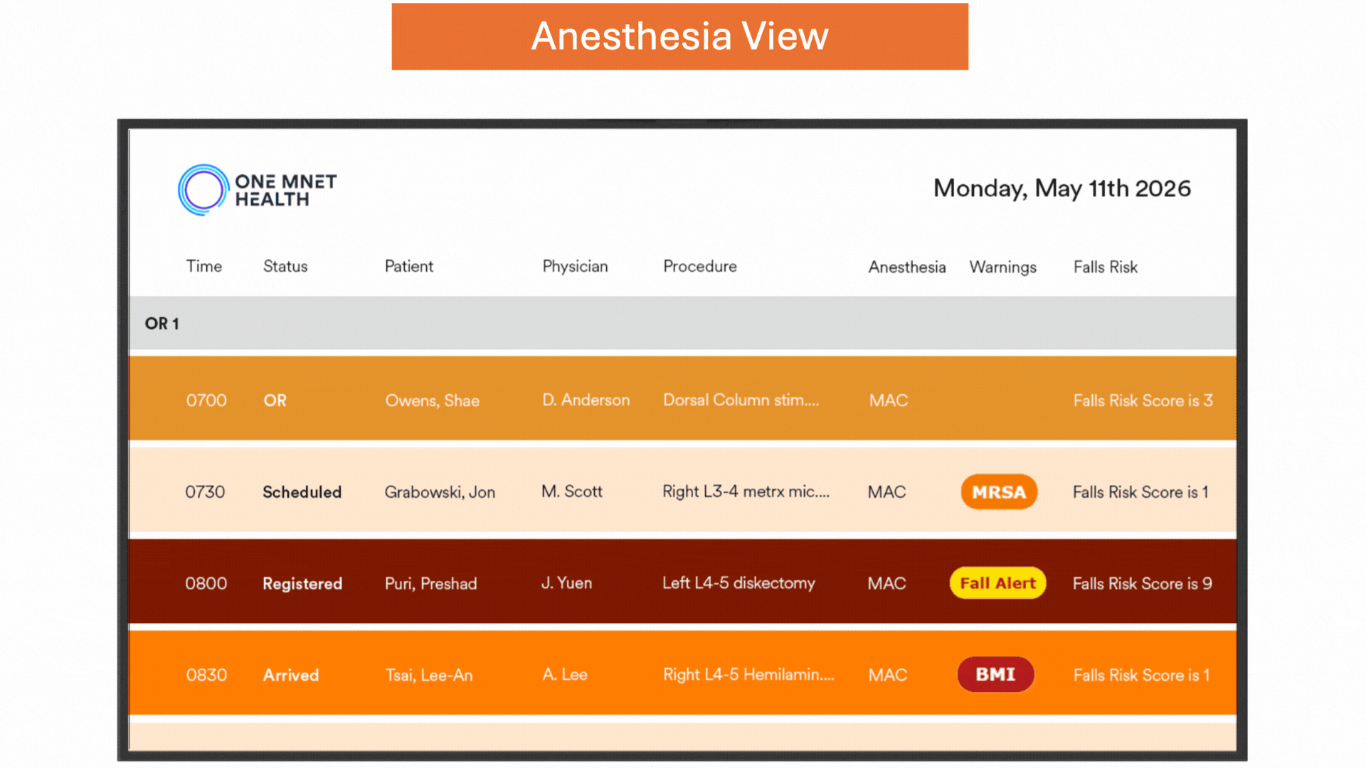 Your staff shouldn’t need to manage constant family phone calls while monitoring critical patient information. Big Board improves this workflow with targeted displays for every audience. Families receive automatic surgery status updates, staff see BMI alerts, fall risk scores, and access tomorrow’s schedule remotely for better staffing decisions, and Physician offices see missing clearances, pending labs, and pre-auth status clearly.